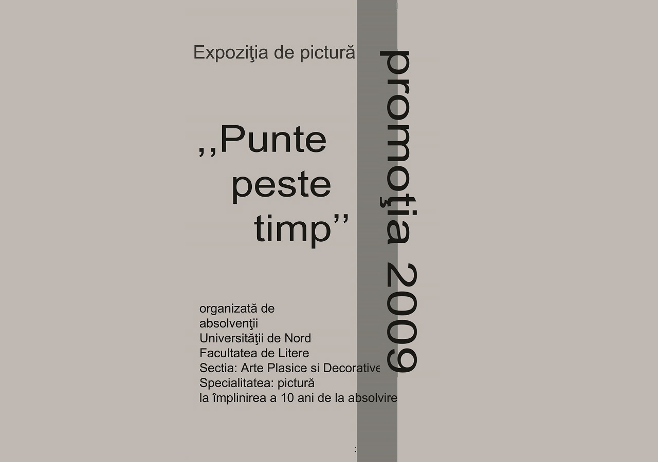 Biblioteca Judeţeană „Petre Dulfu” organizează vernisajul expoziţiei de grup „Promoţia 2009 – Punte peste timp”, cu ocazia a 10 ani de la absolvirea Universităţii de Nord Baia Mare, Facultatea de Litere, Secţia: Arte plastice şi decorative, specializarea: Pictură.