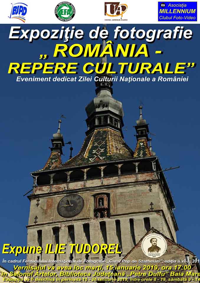 Biblioteca Judeţeană „Petre Dulfu”, Asociaţia „Millennium” Baia Mare, Asociaţia EuroFotoArt Oradea şi Uniunea Artiştilor Plastici vă invită la vernisajul expoziţiei de fotografie „România – repere culturale”, a artistului fotograf Tudorel Ilie. Expoziţia va putea fi vizitată la Salonul Artelor, în perioada 15 – 26 ianuarie 2019, conform programului bibliotecii. Turneul naţional al expoziţiei va parcurge ulterior, toate regiunile istorice ale României, ajungând apoi şi pe la românii din diaspora, în muzee şi alte instituţii de cultură.