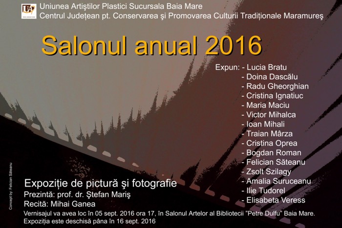 Uniunea Artiştilor Plastici – Sucursala Baia Mare şi Centrul judeţean pentru conservarea şi promovarea culturii tradiţionale Maramureş organizează expoziţia de pictură şi fotografie SALONUL ANUAL 2016. Expoziţia va fi deschisă în perioada 5-16 septembrie 2016, la Biblioteca Judeţeană „Petre Dulfu” – Salonul Artelor şi va fi vernisată luni, 5 septembrie, ora 17.00.