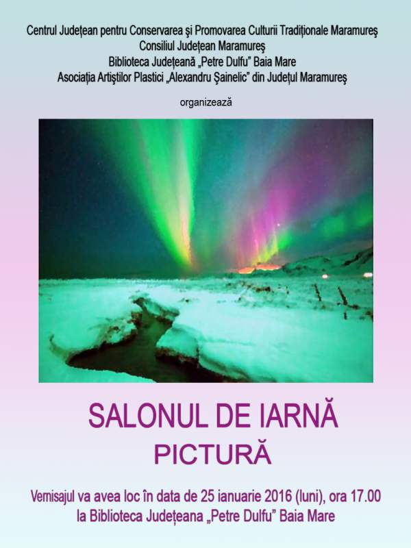 Va avea loc vernisajul expoziţiei de pictură „Salonul de iarnă” al membrilor Asociaţiei Artiştilor Plastici „Alexandru Şainelic”, organizat în colaborare cu Centrul Judeţean pentru Conservarea şi Promovarea Culturii Tradiţionale şi Biblioteca Judeţeană „Petre Dulfu”.