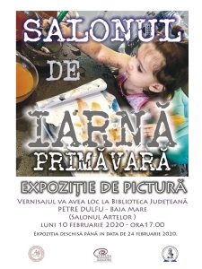 Luni, 10 februarie, de la ora 17, în Salonul Artelor va avea loc vernisajul expoziției de pictură de grup intitulate “Salonul de iarnă-primăvară 2020” al membrilor Asociației Artiștilor Plastici “Alexandru Șainelic”, eveniment organizat în parteneriat cu Biblioteca Județeană “Petre Dulfu” și Centrul Județean pentru Conservarea și Promovarea Culturii Tradiționale Maramureș.