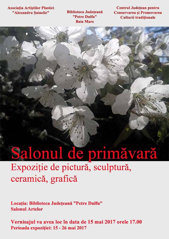 Va avea loc vernisajul „Salonului de primăvară” al membrilor Asociaţiei Artiştilor Plastici „Alexandru Şainelic”. Evenimentul este organizat în cadrul parteneriatului dintre Biblioteca Judeţeană „Petre Dulfu”, Asociaţia Artiştilor Plastici „Alexandru Şainelic” şi Centrul Judeţean pentru Conservarea şi Promovarea Culturii Tradiţionale Maramureş. Expoziţia va fi deschisă la Salonul Artelor, în perioada 15-27 mai.