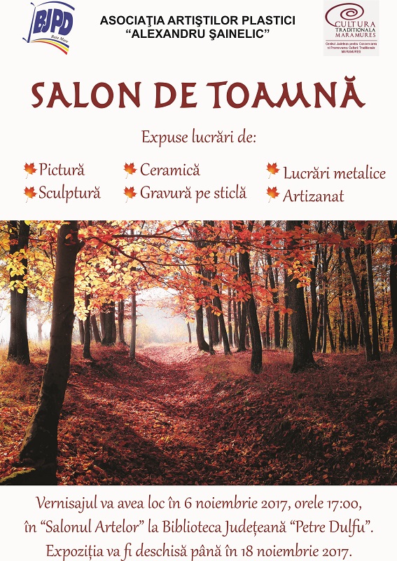 Va avea loc vernisajul expoziţiei de pictură „Salonul de toamnă” al membrilor Asociaţiei Artiştilor Plastici „Alexandru Şainelic”, organizat în colaborare cu Biblioteca Judeţeană „Petre Dulfu” şi Centrul Judeţean pentru Conservarea şi Promovarea Culturii Tradiţionale Maramureş. Expoziţia conţine lucrări de: pictură, sculptură, ceramică, gravură pe sticlă, lucrări metalice, artizanat.