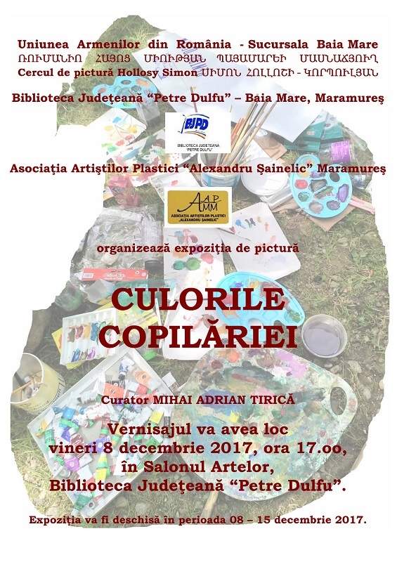 Vineri, 8 decembrie, ora 17, la Salonul Artelor va avea loc vernisajul expoziţiei de pictură „Culorile copilăriei”, organizat de Cercul de pictură „Hollosy Simon” al Uniunii Armenilor din România în colaborare cu Biblioteca Judeţeană „Petre Dulfu” şi Asociaţia Artiştilor Plastici „Alexandru Şainelic”.