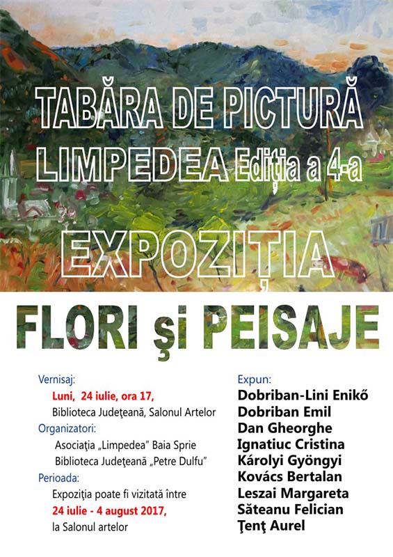 Asociaţia „Limpedea” Baia Sprie în colaborare cu Biblioteca Judeţeană „Petre Dulfu” organizează vernisajul expoziţiei intitulate „Flori şi peisaje”, ale cărei lucrări au fost realizate în cadrul celei de-a 4-a ediţii a Taberei de pictură de la Pensiunea „Limpedea”.