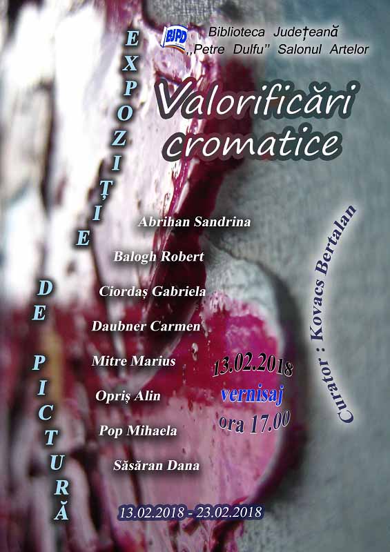 Va avea loc vernisajul expoziţiei de pictură de grup cu titlul „Valorificări cromatice”, a studenţilor de la masteratul „Valori plastice și reflexive ale imaginii în pictura contemporană”, din cadrul Universității Tehnice Cluj-Napoca, Centrul Nord din Baia Mare, care vor expune creații personale ale picturii de șevalet, cu o tematică variată: natura, abstracționismul și portretul.