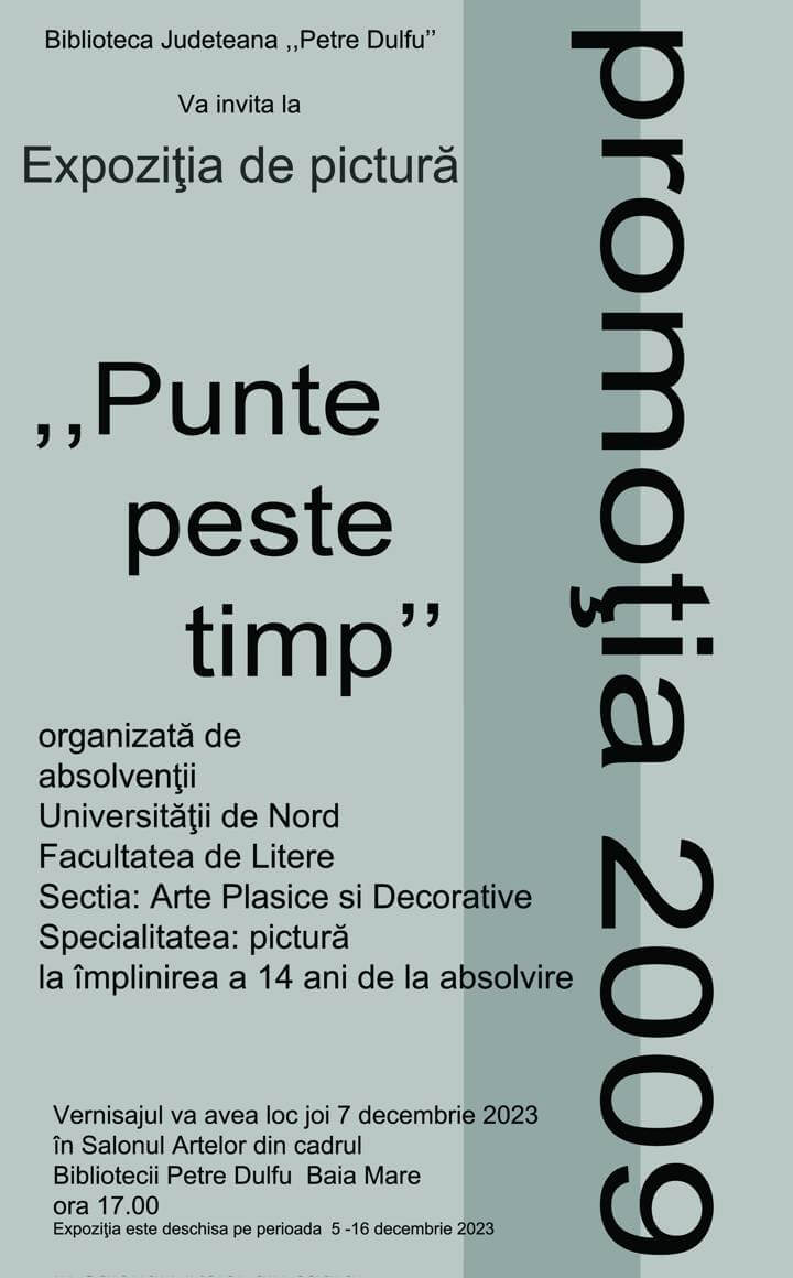 Asociația Artiștilor Plastici „Alexandru Șainelic” în colaborare cu Biblioteca Județeană „Petre Dulfu” organizează vernisajul expoziției de pictură „Promoția 2009” a absolvenților Facultății de Litere – Secția Arte plastice și decorative, la împlinirea a 14 ani de la absolvire. Expoziția va putea fi vizitată la Salonul Artelor în perioada 5 – 16 decembrie 2023.