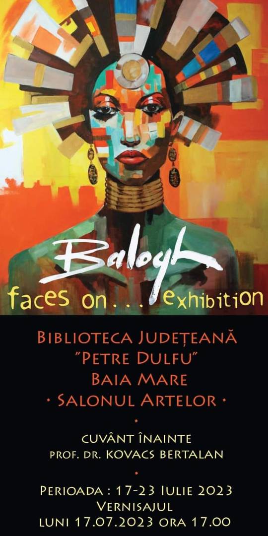 Luni, 17 iulie, cu începere de la ora 17, la Salonul Artelor va avea loc vernisajul expozitiei personale Balogh Robert Carol, „Faces on… exibition”, organizat de Asociatia Artistilor Plastici „Alexandru Sainelic”. Cuvânt înainte: prof. dr. Kovacs Bertalan.