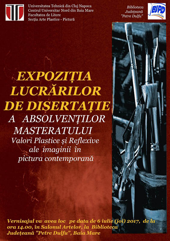 Secţia de Arte Plastice – Pictură a Facultăţii de Litere – Universitatea Tehnică Cluj-Napoca, Centrul Universitar Nord Baia Mare în colaborare cu Biblioteca Judeţeană „Petre Dulfu” organizează vernisajul expoziţiei lucrărilor de disertaţie a absolvenţilor masteratului „Valori plastice şi reflexive ale imaginii în pictura contemporană”.