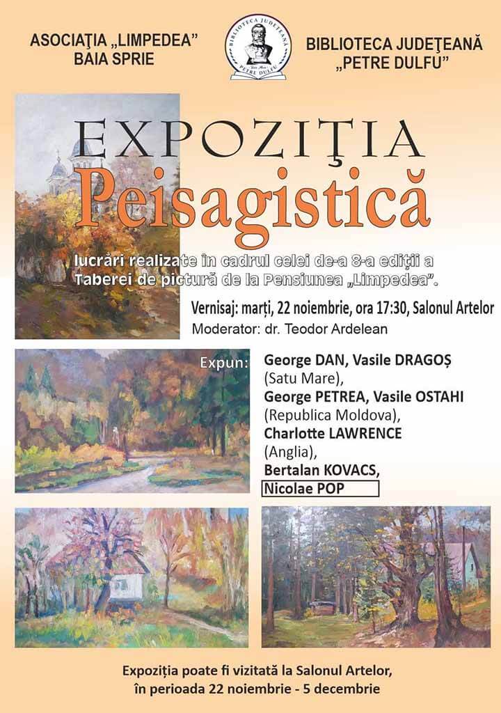 Marți, 22 noiembrie, de la ora 17:30, în Salonul Artelor, Asociaţia „Limpedea” Baia Sprie în colaborare cu Biblioteca Judeţeană „Petre Dulfu” organizează vernisajul expoziţiei „Peisagistică”, ale cărei lucrări au fost realizate în cadrul celei de-a 8-a ediţii a Taberei de pictură de la Pensiunea „Limpedea”.