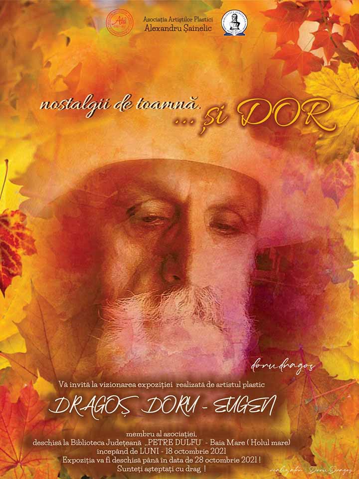 Biblioteca Județeană „Petre Dulfu” în colaborare cu Asociația Artiștilor Plastici „Alexandru Șainelic” vă invită să vizionați expoziția de artă plastică intitulată „Nostalgii de toamnă și… Dor”, cuprinzând 40 de lucrări realizate în tehnică mixtă (print și acuarelă), de către artistul plastic Doru-Eugen Dragoș, membru al Asociației Artiștilor Plastici „Alexandru Șainelic”. Expoziția poate fi vizitată în perioada 18 – 29 octombrie, în holul mare al bibliotecii.
