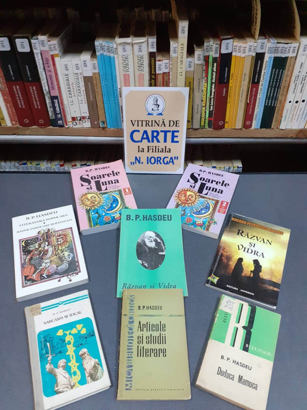„Incursiune în opera lui Bogdan Petriceicu Hasdeu” – vitrină de carte realizată pentru perioada 22 – 28 august, la Filiala Nicolae Iorga, cu ocazia comemorării a 115 de ani de la moartea scriitorului Bogdan Petriceicu Hasdeu (25 august 1907).
