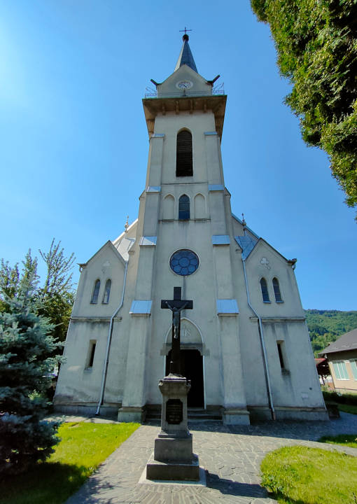 Impozanta biserică de rit romano-catolic, aflată în centrul orașului, a fost construită în 1912 de către preotul Schiller Carol pe locul fostei biserici din lemn (1762), în stil neogotic, fiind singura de acest fel şi tip din Ardeal şi din nordul ţării. Altarele au fost realizate în anul 1911 și aduse de către Ferdinand Stuflesser din Tirol, Austria.
