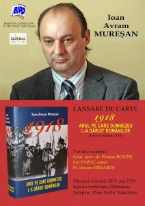 Biblioteca Judeţeană „Petre Dulfu” organizează lansarea cărţii „1918: Anul pe care Dumnezeu l-a dăruit românilor”, autor Ioan Avram Mureşan, apărut la editura Marist, Baia Mare, 2018.