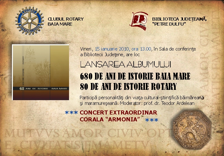 Clubul ROTARY Baia Mare şi Biblioteca Judeţeană “Petre Dulfu” vă invita la lansarea albumului de excepţie „680 DE ANI DE ISTORIE BAIA MARE. 80 DE ANI DE ISTORIE ROTARY”, care are loc vineri, 15 ianuarie a.c., ora 13.00, în Sala de conferinţe a Bibliotecii Judeţene. La eveniment participă personalităţi din viaţa cultural-ştiinţifică băimăreană şi maramureşeană. Moderator: prof. dr. Teodor Ardelean. Lansarea albumului va fi onorată prin prestaţia artistică a Coralei ARMONIA: cântece pe textele lui Mihai Eminescu.
