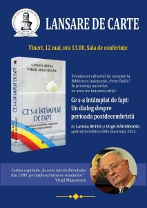 Eveniment editorial de excepție la Biblioteca Județeană „Petre Dulfu”, în 12 mai 2023, la Sala de conferințe. În prezența autorilor, va avea loc lansarea cărţii „Ce s-a întâmplat de fapt : Un dialog despre perioada postdecembristă” de Lavinia Betea și Virgil Măgureanu, apărută la Editura RAO, București, 2022.
