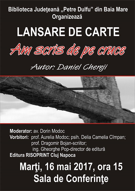 Va avea loc lansarea volumului de poezii „Am scris de pe cruce„, autor Daniel Chereji, volum apărut la Editura Risoprint, Cluj-Napoca, 2017.
