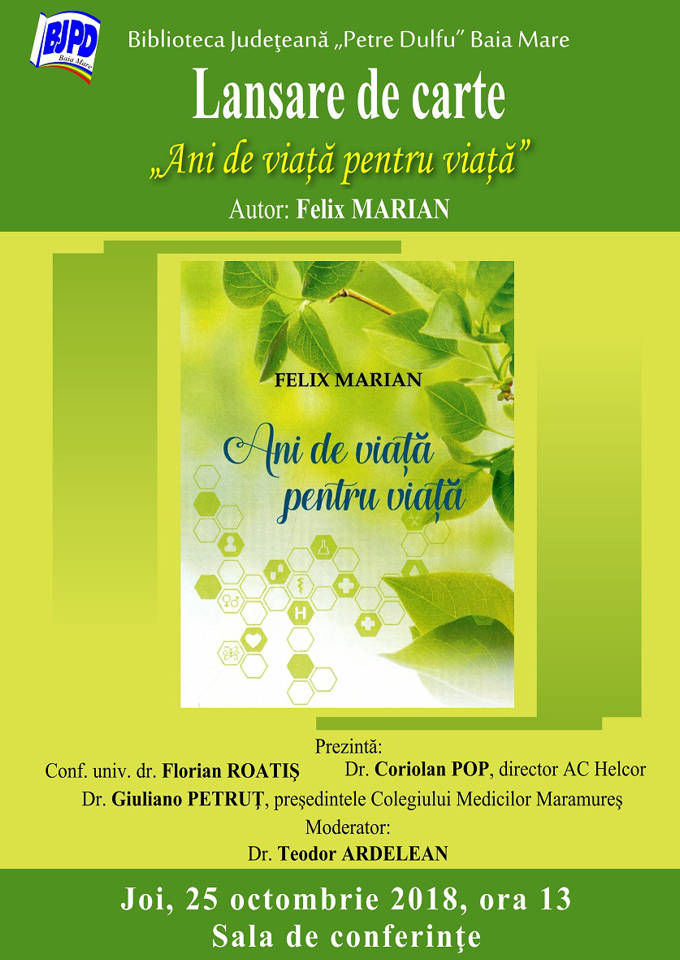 Biblioteca Judeţeană „Petre Dulfu” organizează lansarea cărţii „Ani de viaţă pentru viaţă”, semnată de medicul Felix Marian, apărută la Editura Eurotip, Baia Mare, 2018.