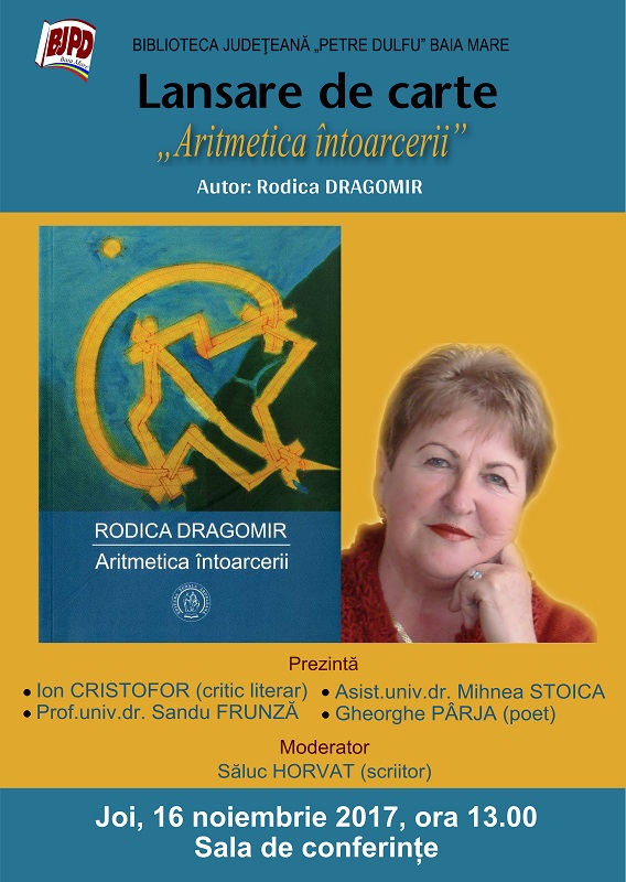 Va avea loc lansarea volumului de poezii „Aritmetica întoarcerii”, de Rodica Dragomir, apărut la editura Şcoala Ardeleană, Cluj-Napoca, 2017.