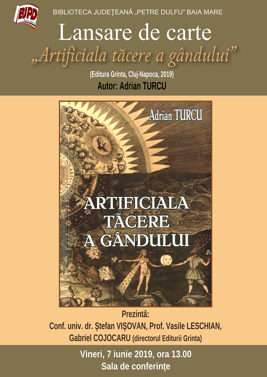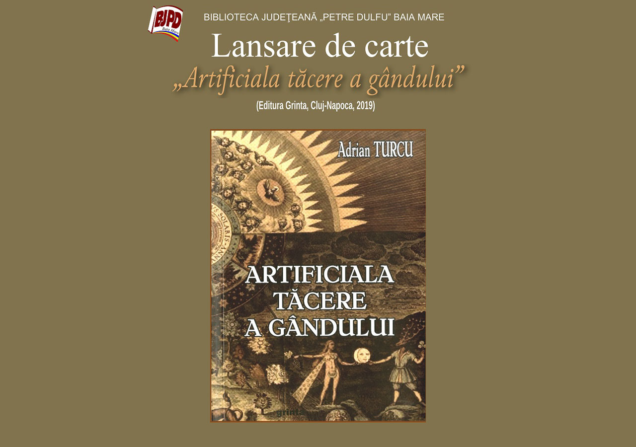 Biblioteca Judeţeană „Petre Dulfu” organizează lansarea cărţii „Artificiala tăcere a gândului”, de Adrian Turcu, apărută la Editura Grinta, Cluj-Napoca, 2019.