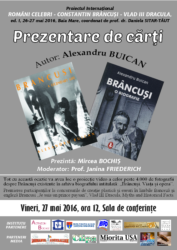 Va avea loc prezentarea cărţilor „Brancusi. A Legendary Life” (Actaeon Books, Baia Mare, 2016), „Brȃncuşi. O biografie” (Editura Artemis, Bucureşti, 2006), ambele semnate de Alexandru Buican.