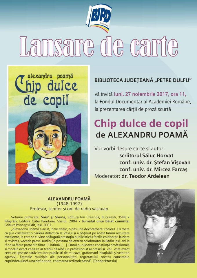 Biblioteca Judeţeană „Petre Dulfu” vă invită la prezentarea cărţii „Chip dulce de copil”, autor Alexandru Poamă (1948-1997, profesor, scriitor şi om de radio vasluian).