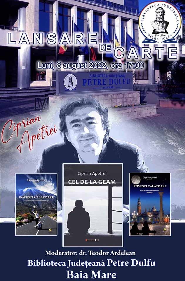 Luni, 8 august, de la ora 17.00, la Biblioteca Județeană „Petre Dulfu” Baia Mare, Ciprian Apetrei, profesor de filosofie, scriitor și jurnalist, a lansat cărțile „Cel de la Geam” (apărută la editura Eikon) și „Povești călătoare” (apărută la editura Minela).