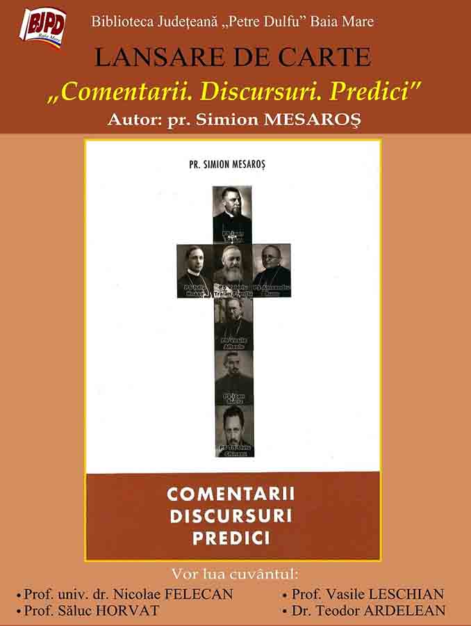 Biblioteca Judeţeană „Petre Dulfu” organizează lansarea cărţii „Comentarii. Discursuri. Predici”, semnată de pr. Simion Mesaroş, publicată la editura Marist, Baia Mare, 2018.