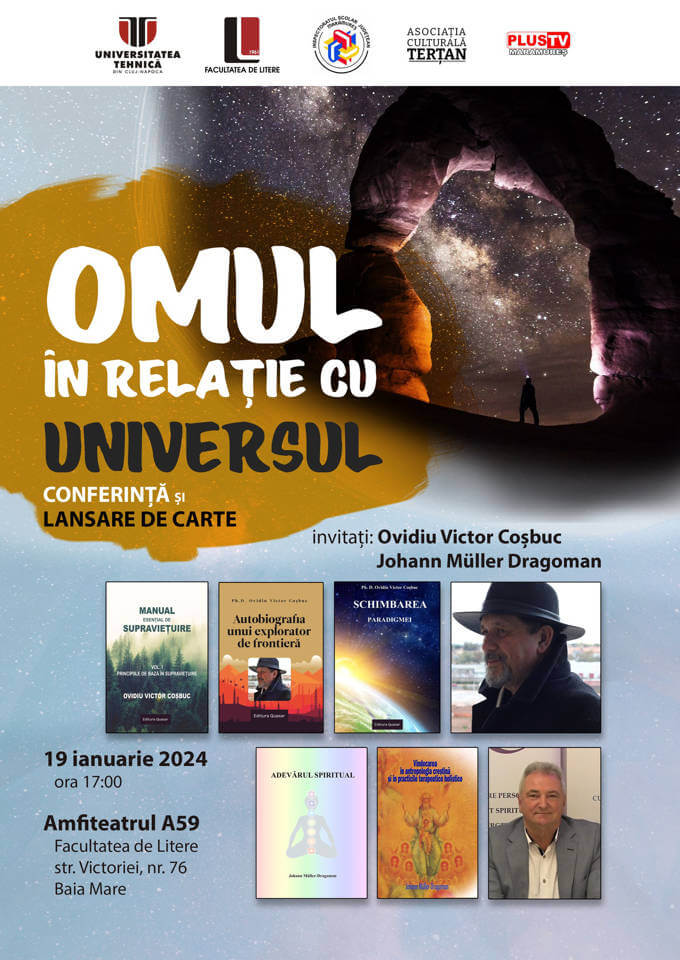 Vineri, 19 ianuarie, ora 17:00, la Facultatea de litere din Baia Mare, Amfiteatrul A59, va avea loc conferința și lansarea de carte „Omul în relație cu Universul”, eveniment organizat de Asociația Culturală Terțan.