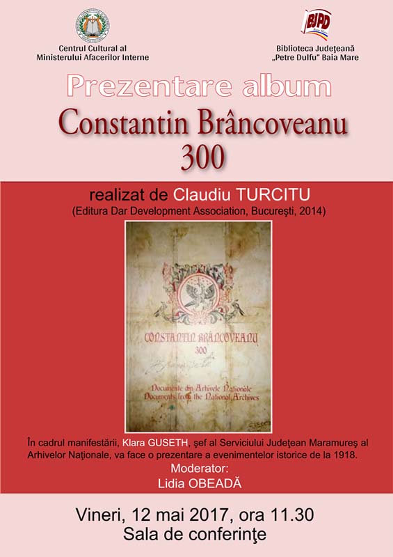 Va avea loc prezentarea albumului „Constantin Brâncoveanu – 300„, istorie în documente, publicat la Editura Dar Development Association, Bucureşti, 2014. Albumul a fost realizat de referent Claudiu Turcitu, șeful Biroului Arhive Medievale, Fonduri Personale și Colecții din cadrul Arhivelor Naționale din București.
