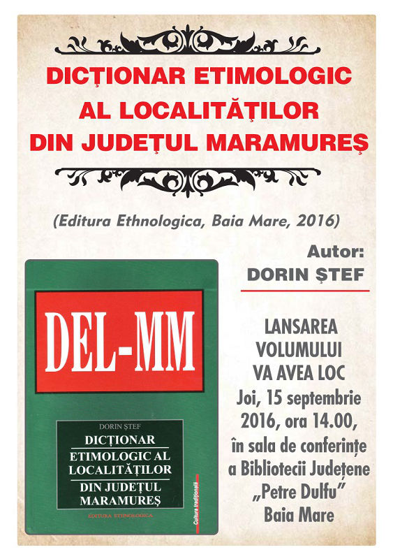 Va avea loc lansarea volumului „Dicţionar etimologic al localităţilor din judeţul Maramureş„, de Dorin Ştef, apărut la Editura Ethnologica, Baia Mare, 2016.