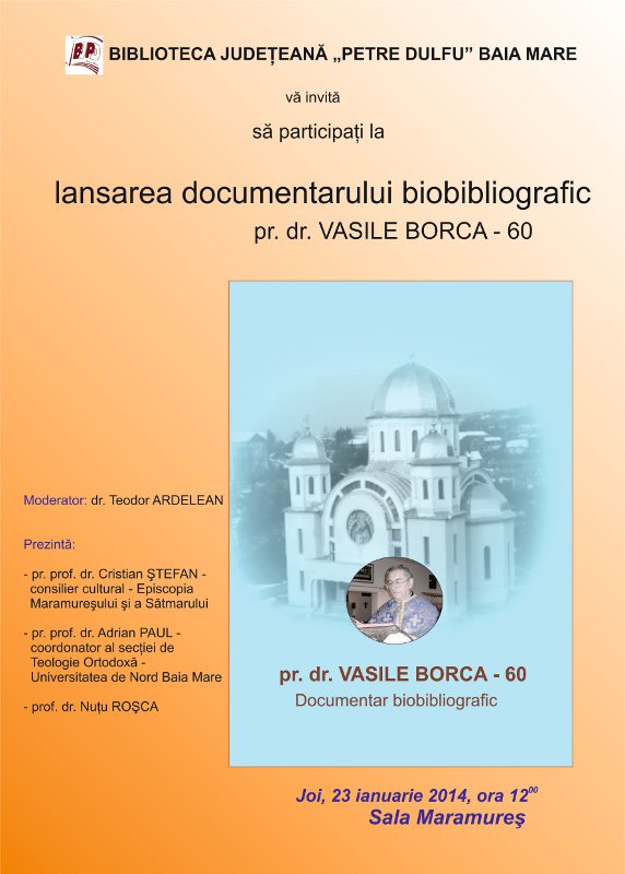 Va avea loc lansarea documentarului biobibliografic aniversar Vasile Borca – 60. Participă: preot dr. Cristian Ștefan, preot dr. Paul Adrian, pofesor dr. Nuțu Roșca. Moderator: dr. Teodor Ardelean. Documentarul, în format PDF este disponibil pe site-ul bibliotecii aici.