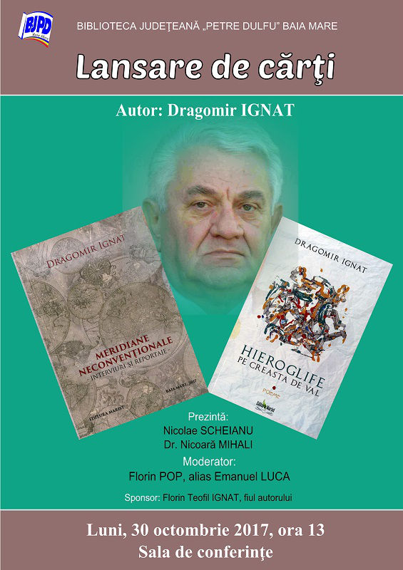 Biblioteca Judeţeană „Petre Dulfu” vă invită la o dublă lansare de carte a jurnalistului şi poetului Dragomir Ignat. Vor fi lansate volumele: “Hieroglife pe creasta de val” – poezie şi „Meridiane neconvenţionale”- interviuri şi reportaje, ambele apărute la editura Marist, Baia Mare.