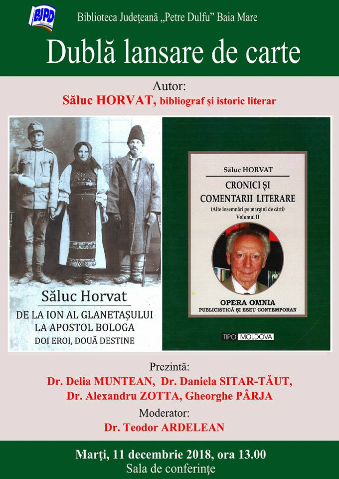 Biblioteca Judeţeană „Petre Dulfu” organizează lansarea volumelor semnate de bibliograful şi istoricul literar Săluc Horvat: „De la Ion al Glanetaşului la Apostol Bologa. Doi eroi, două destine”, apărut la Editura Şcoala Ardeleană, Cluj-Napoca, 2017 şi „Cronici şi comentarii literare”, vol. II, apărut la Editura Tipo Moldova, Iaşi, 2018.