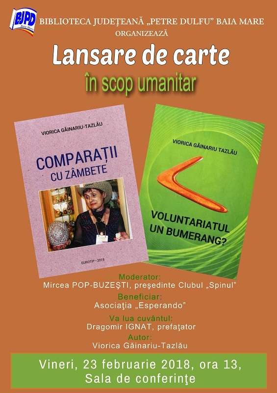 Biblioteca Judeţeană „Petre Dulfu” Baia Mare organizează o dublă lansare de carte a epigramistei Viorica Găinariu Tazlău. Vor fi lansate următoarele titluri: „Comparaţii cu zâmbete” (carte de umor) şi „Voluntariatul un bumerang?”, apărute la Editura Eurotip, Baia Mare, 2018.