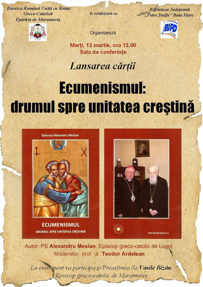 Episcopia Greco-Catolică a Maramureşului în colaborare cu Biblioteca Judeţeană „Petre Dulfu” Baia Mare au lansat cartea Ecumenismul – drumul spre unitatea creştină, autor PS Alexandru Mesian, Episcopul greco-catolic de Lugoj. La eveniment a participat şi Preasfinţia Sa Vasile Bizău, Episcop greco-catolic de Maramureş. Moderator: Prof. dr. Teodor Ardelean. Evenimentul a avut loc în Sala de conferinţe a bibliotecii.