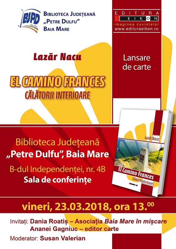 Biblioteca Judeţeană „Petre Dulfu” în colaborare cu Editura Eikon organizează lansarea cărţii „El Camino Frances. Călătorii interioare”, de Lazăr Nacu, apărută la Cluj-Napoca, 2018, la editura mai sus amintită.