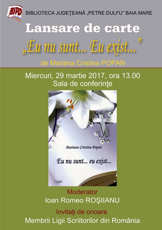 Miercuri, 29 martie, ora 13, în Sala de conferinţe, va avea loc lansarea volumului de poezii „Eu nu sunt…Eu exist”, semnat de Mariana Cristina Popan, membră a Ligii Scriitorilor din România.