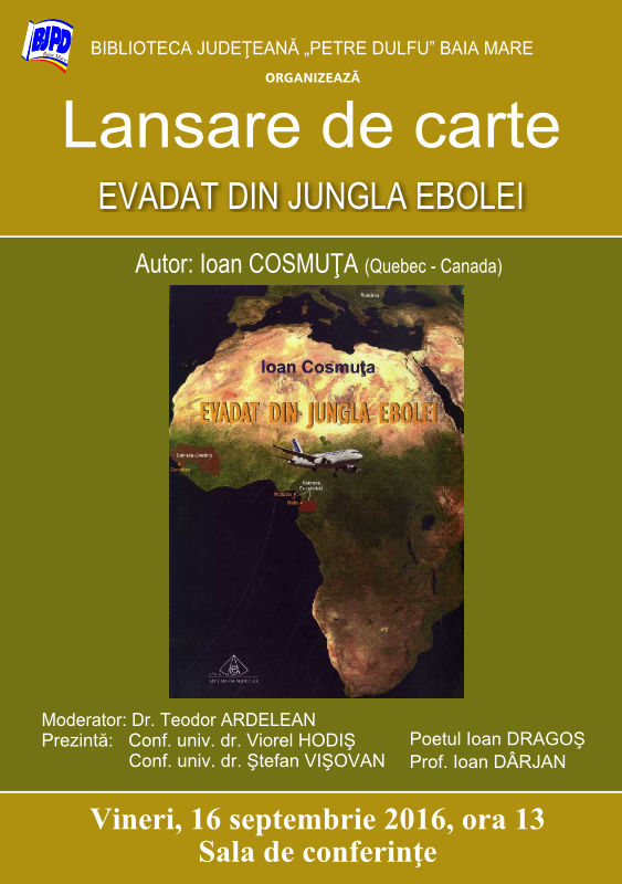 Va avea loc lansarea cărţii „Evadat din jungla Ebolei„, de Ioan Cosmuţa (Quebec, Canada), apărută la Editura Imprimeria Ardealul, Cluj-Napoca, 2015.