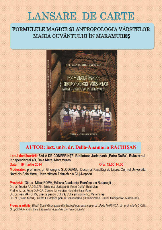 Centrul Universitar Nord Baia Mare – Facultatea de Litere în colaborare cu Biblioteca Judeţeană organizează lansarea cărţii „Formulele magice şi antropologia vârstelor. Magia cuvântului în Maramureş„, autor: lect. univ. dr. Delia Anamaria Răchişan.