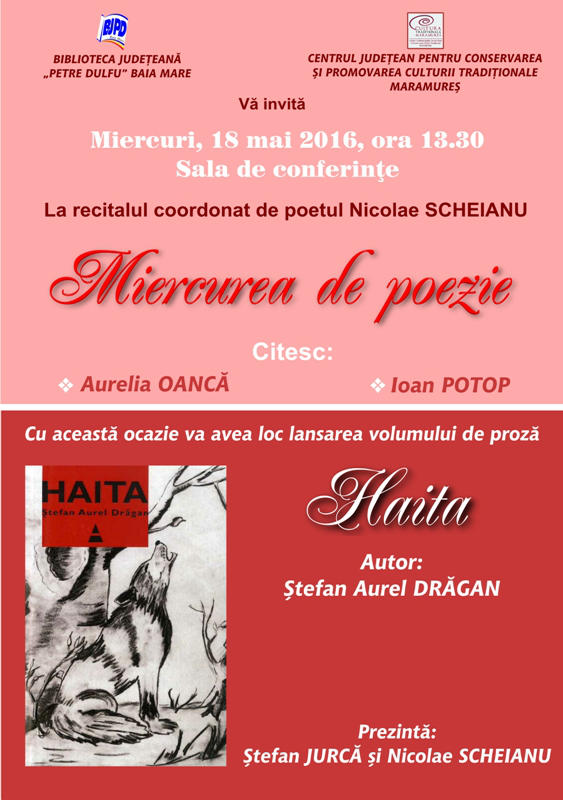 Tot cu această ocazie va fi lansat volumul de proză „Haita”, aparţinând lui Ştefan Aurel Drăgan.