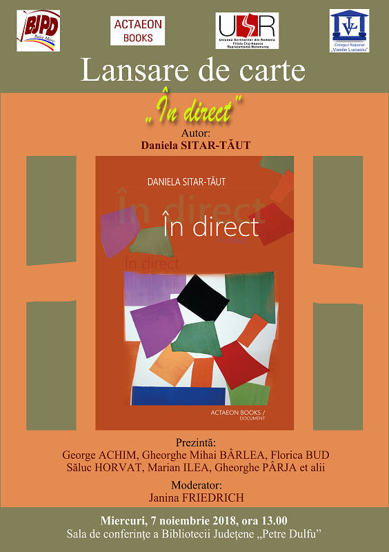 Va avea loc lansarea volumului de interviuri „În direct”, semnat de prof. dr. Daniela Sitar Tăut, apărut la editura Acteon Books, Baia Mare, 2018. Evenimentul este organizat de Uniunea Scriitorilor Români – Fliliala Cluj-Napoca, Reprezentanţa Maramureş în colaborare cu Colegiul Naţional „Vasile Lucaciu”, Biblioteca Judeţeană „Petre Dulfu” şi editura Acteon Books.
