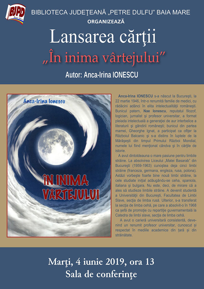 Biblioteca Judeţeană „Petre Dulfu” organizează lansarea cărţii „În inima vârtejului”, de Anca Irina Ionescu, volum autobiografic apărut la editura Oscar Print, Bucureşti, 2019.