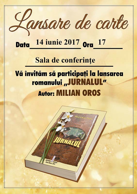 Va avea loc lansarea cărţii „Jurnalul”, apărută la Editura Enesis, Baia Mare, 2017, semnată de Milian Oros, membru al Ligii Scriitorilor Români – Filiala Maramureş.