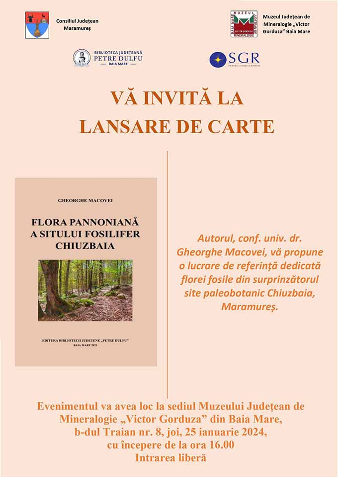 Joi, 25 ianuarie, de la ora 16, la Muzeul Județean de Mineralogie „Victor Gorduza”, Consiliul Județean Maramureș în colaborare cu Muzeul Județean de Mineralogie „Victor Gorduza”, Biblioteca Județeană „Petre Dulfu” și Societatea Geologică a României organizează, lansarea cărții „Flora pannoniană a sitului fosilifer Chiuzbaia”, autor conf. univ. dr. Gheorghe Macovei, apărută la Editura Bibliotecii Județene „Petre Dulfu”, Baia Mare, 2023. Lucrarea este una de referință dedicată florei fosile din surprinzătorul site paleobotanic Chiuzbaia, Maramureș.