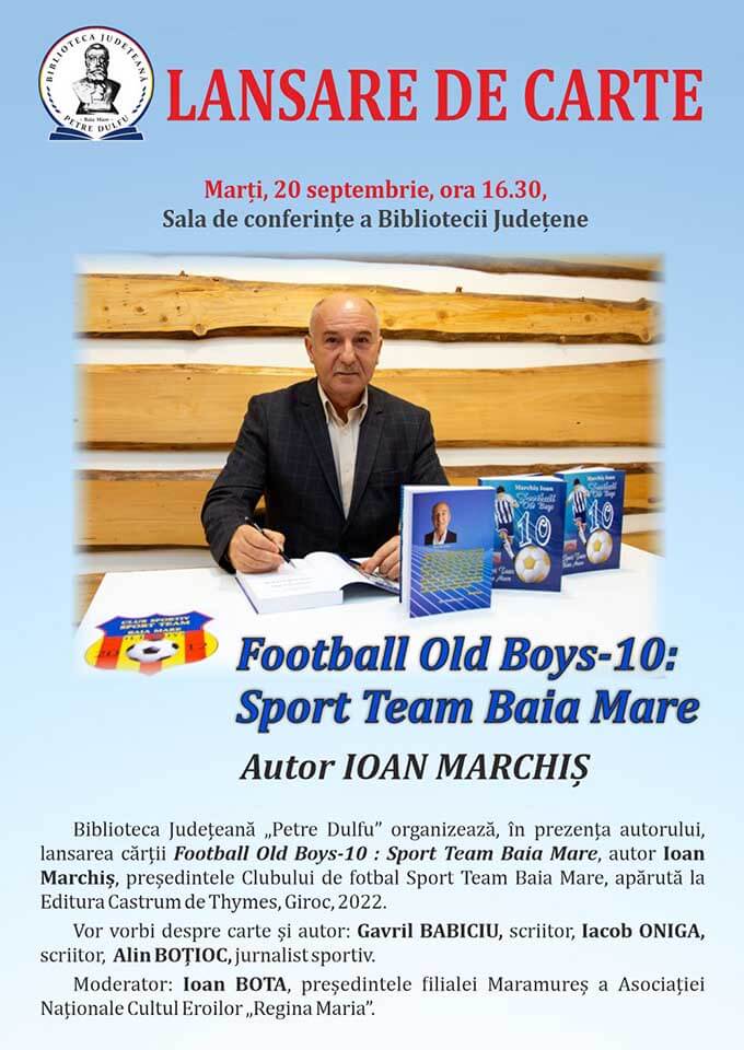 Biblioteca Județeană „Petre Dulfu” organizează în prezența autorului, lansarea cărții „Football Old Boys-10 : Sport Team Baia Mare”, autor Ioan Marchiș, președintele Clubului de fotbal Sport Team Baia Mare, apărută la Editura Castrum de Thymes, Giroc, 2022.