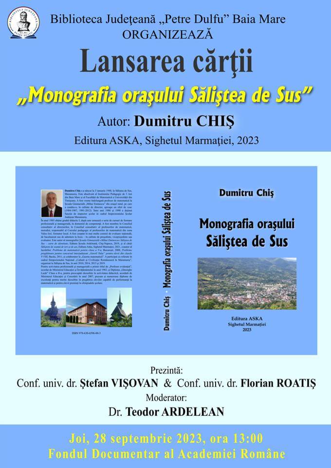 Biblioteca Județeană „Petre Dulfu” Baia Mare organizează lansarea cărțiii „Monografia orașului Săliștea de Sus”, autor profesor Dumitru Chiș, apărut la Editura Aska Grafika, Sighetul Marmației, 2023.