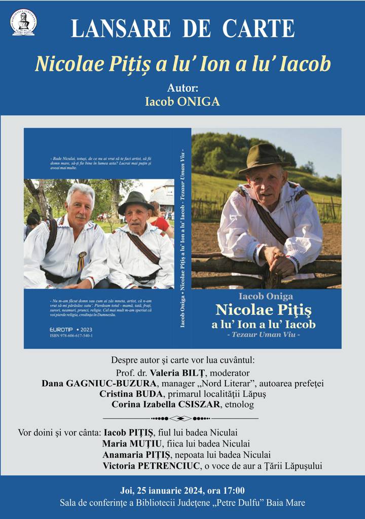 Biblioteca Județeană „Petre Dulfu” Baia Mare organizează lansarea volumului „Nicolae Pițiș a lu’ Ion a lu’ Iacob – Tezaur Uman Viu”, autor Iacob Oniga, scriitor maramureșean, originar din Țara Lăpușului.