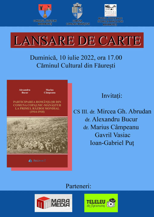 Duminică, 10 iulie 2022, începând cu ora 17.00, la Căminul Cultural din Făurești va avea loc lansarea cărții Participarea românilor din comuna Copalnic-Mănăștur la Primul Război Mondial (1914-1918), autori Alexandru Bucur și Marius Câmpeanu.