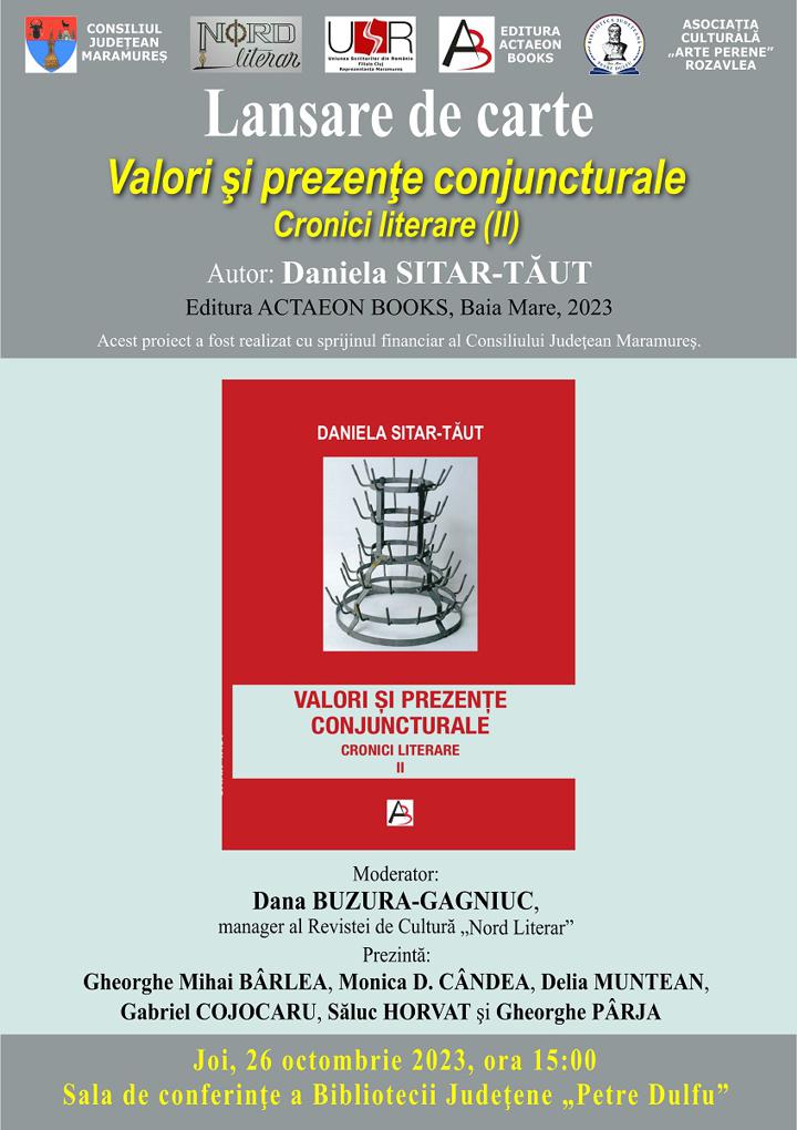Consiliul Județean Maramureș în colaborare cu Revista de Cultură „Nord Literar”, Reprezentanța Maramureș a Uniunii Scriitorilor din România, Editura Acteon Books, Biblioteca Județeană „Petre Dulfu” și Asociația culturală „Arte perene” Rozavlea organizează lansarea cărții „Valori și prezențe conjucturale. Cronici literare (II)”, autor Daniela Sitar Tăut, apărută la Editura Acteon Books, Baia Mare, 2023.